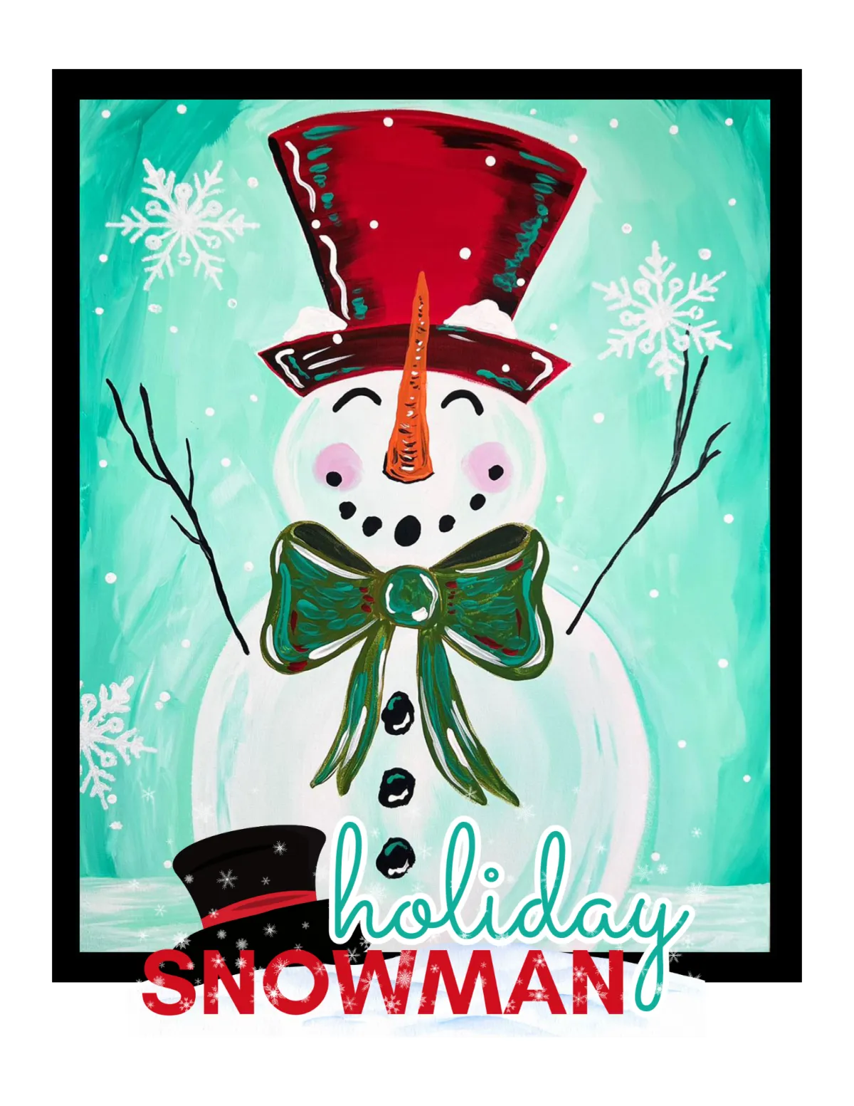 Holiday Snowman Paint Party! Perfect for all skill levels, this guided session will lead you step-by-step in creating your very own charming snowman masterpiece. Gather your friends, sip on some hot cocoa, and let your imagination run wild as we celebrate the magic of winter.